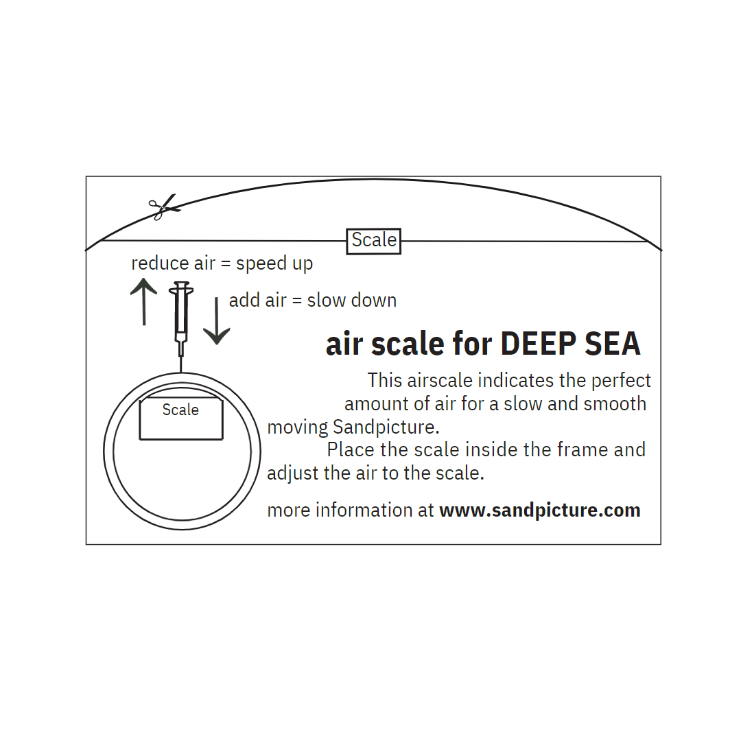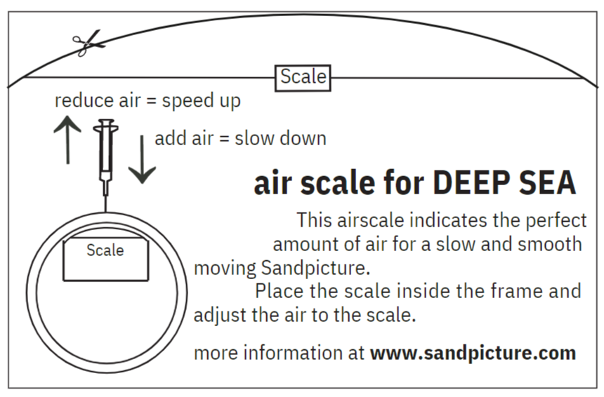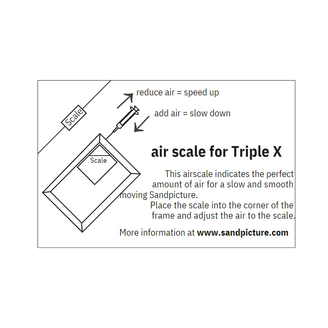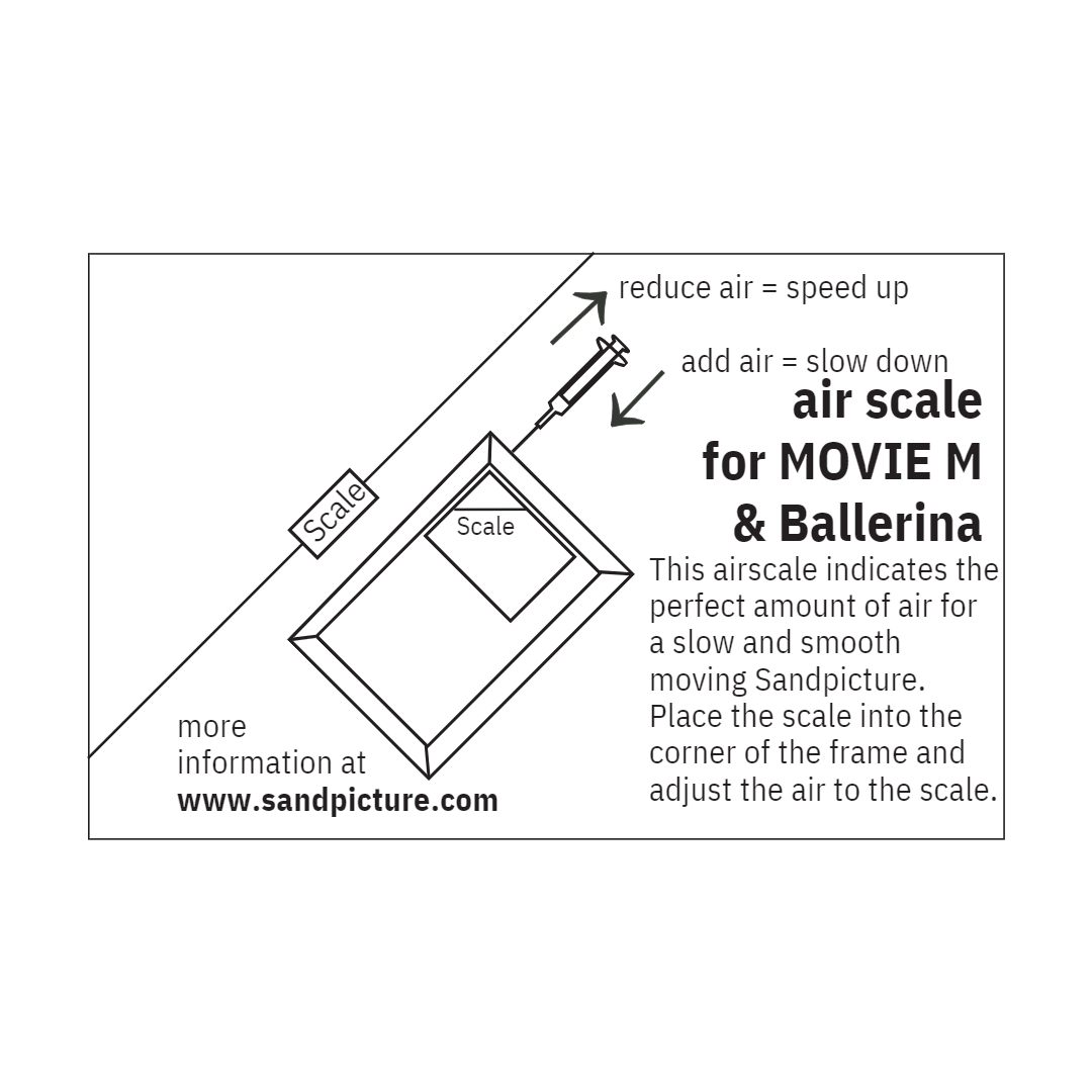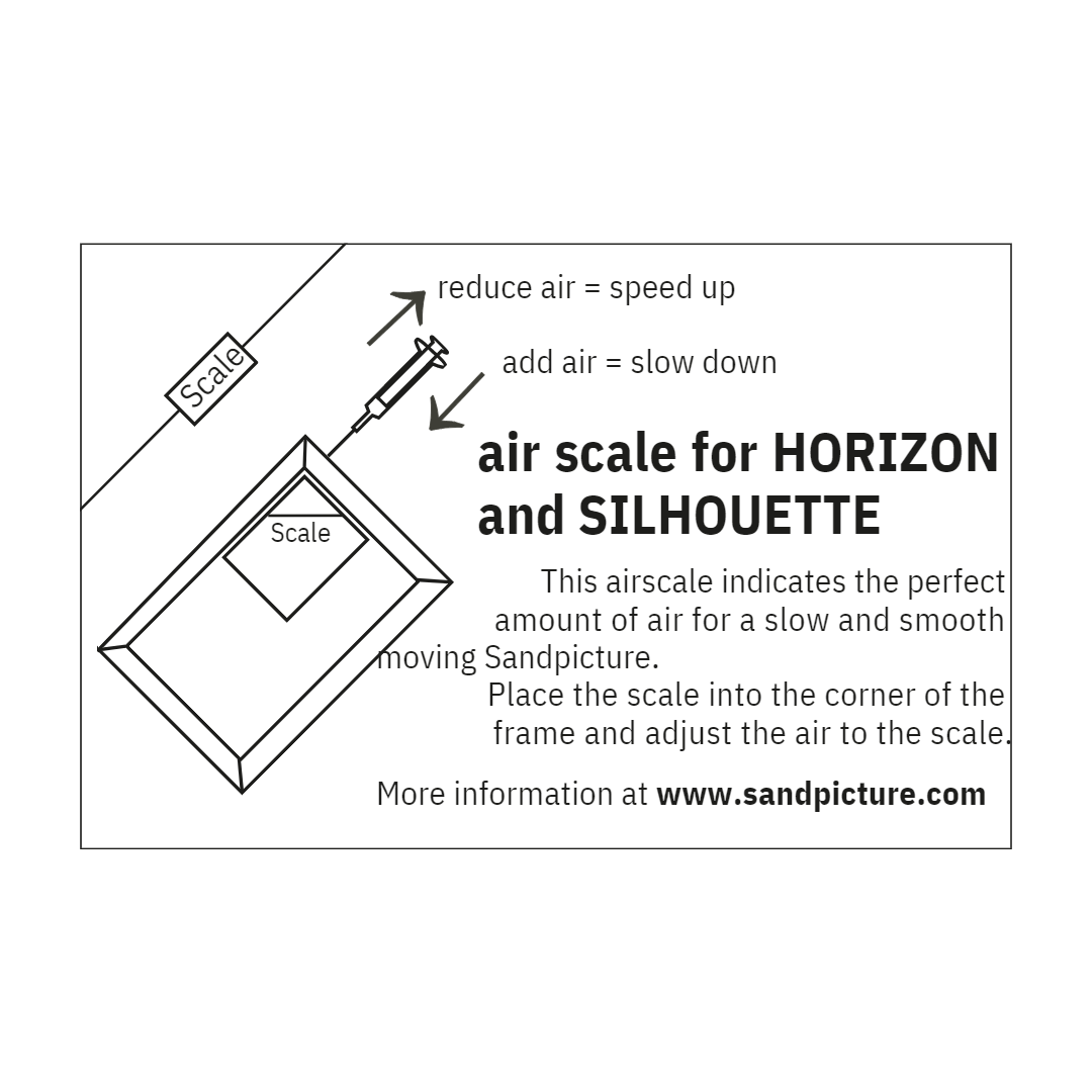 The Airscale is used as a guide for the recommended amount of air in your sand picture. It may be difficult to figure out how much air is required in your sand picture. The Airscale takes the guesswork out. Just align the clear scale with your fame near the air hole and adjust the air to the recommended airline.