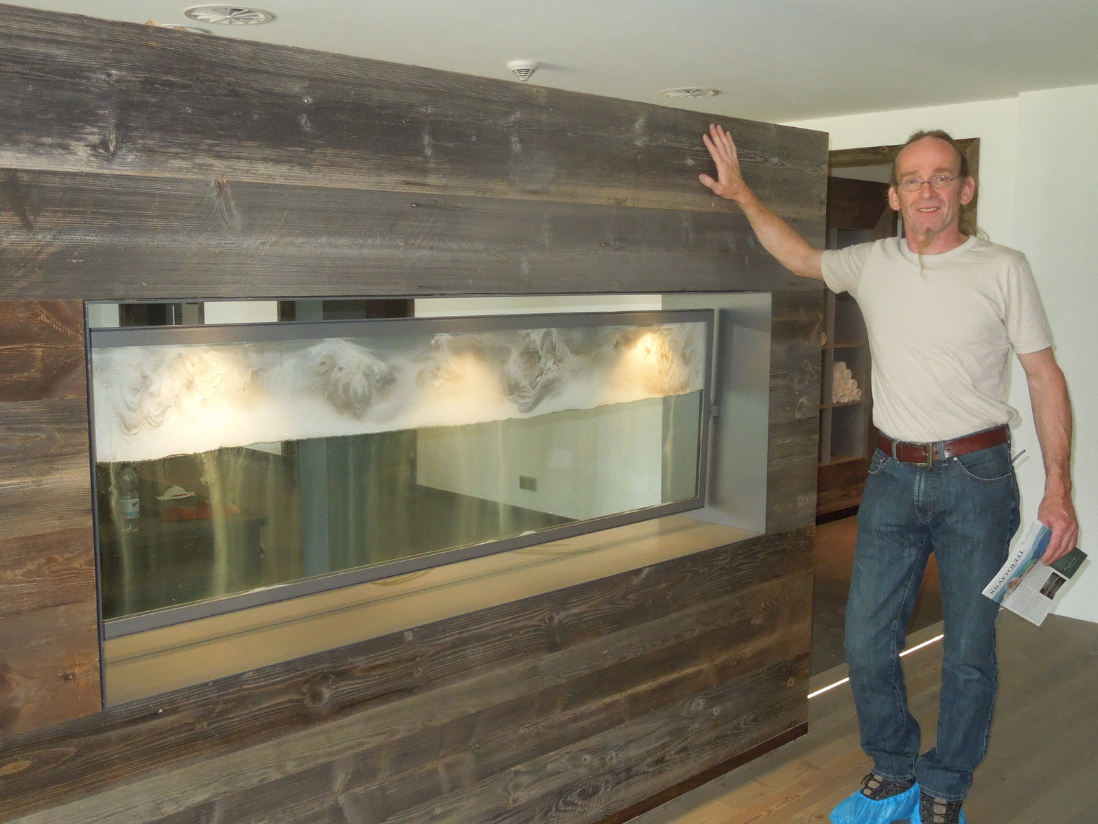 Our moving sand art is a beautiful collaboration between nature and world-renowned kinetic artist Klaus “The Sandman” Bosch. Each piece is meticulously handcrafted using a combination of natural sands, synthetic sands, and crushed gemstones, blended with a unique soap mixture. Since 1988, Sandman has perfected his craft. Each sand color has a distinct density, preventing the sands from mixing and allowing for the formation of stratification lines, similar to the processes of nature over millions of years. The artwork operates on the principle of gravity, which pulls our proprietary blend of fine-grained sand through the air bubbles that create barriers, resulting in a one-of-a-kind 3-D landscape with every turn. You can adjust the amount of air in the KB Collection sand art, which influences the speed of the sand flow. This feature ensures that our KB Collection sand art can be treasured for many years to come.