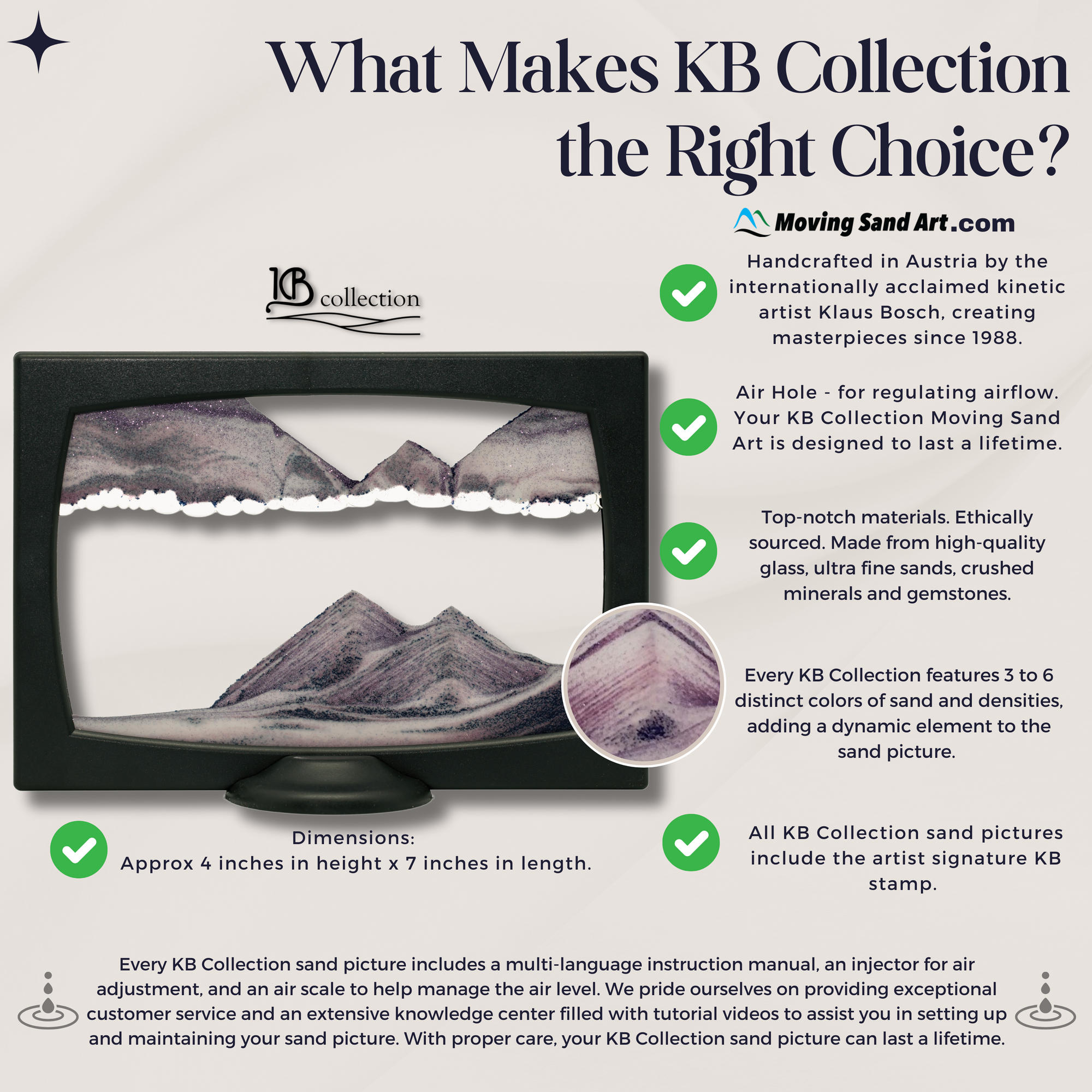 The Sandman makes the KB Collection Sand Pictures in his studio in Lustenau, Austria. This beautiful small city is embraced by the Alps and overlooks the shores of Lake Constance. Klaus works closely with his small team of detail oriented, skilled craftsman to create his works of art that are beloved worldwide. Klaus is proud of the fair wages and exceptional work environment offered at his sand factory. Sandman makes sourcing from local companies a priority for all components used in the making of the sand art. Making ethical, sustainable art is a must.